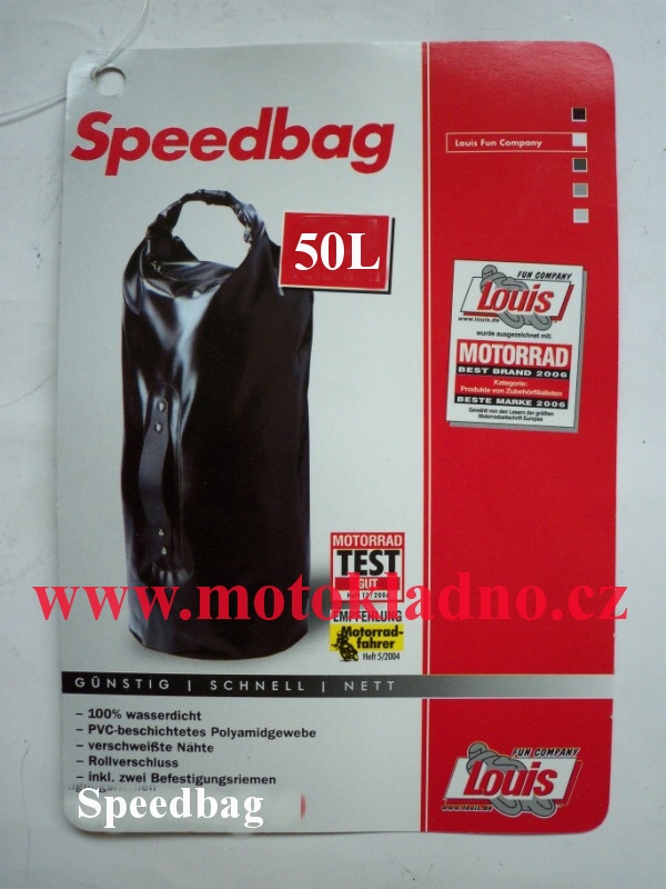 Univerzální nepromokavý vak na převoz věcí na zadním nosiči. Objem 50L. Držátko pro přenášení. S logem Louis.